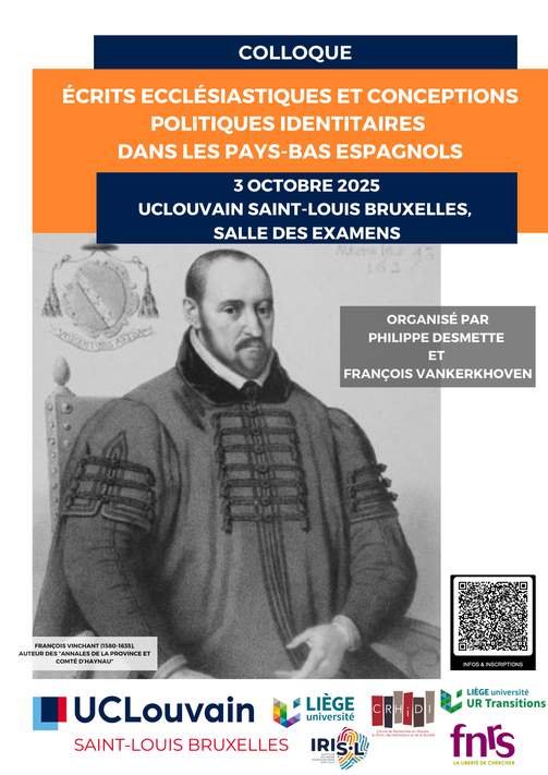 Il pourra donc s’agir d’œuvres dont la vocation première, la thématique est de nature ecclésiastique ou religieuse, mais également de travaux qui envisagent plutôt une réalité civile (ville, principauté,…). Dans les deux cas, on pourra dégager le point de vue de l’auteur par rapport à la question de l’identité/des identités au sein des Pays-Bas espagnols. Une approche historiographique, examinant l’utilisation a posteriori de telles productions, pourrait également enrichir le débat.