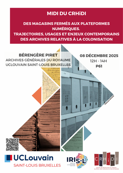 L'intervention de Bérengère Piret portera sur les archives relatives à la colonisation, produites en Belgique, mais aussi sur les espaces formant aujourd’hui le Burundi, la République démocratique du Congo, et le Rwanda. Elle retracera l’histoire du traitement de ces fonds, depuis leur production et leur transfert massif vers la Belgique, jusqu’à leur transfert vers les Archives de l’État et la mise en ligne de ces fonds. Elle permettra de mettre en évidence que le traitement des archives relatives à la colonisation ne se limite pas à des opérations techniques, mais constitue un véritable geste de sens : il éclaire le contenu des fonds, oriente les usages et contribue à renouveler la compréhension de l’histoire de la colonisation.