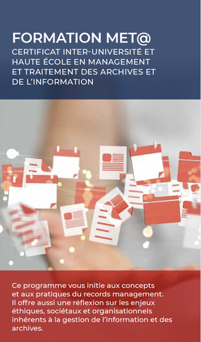 Vous êtes amené à réfléchir aux moyens d’assurer la sélection, la conservation, l’organisation, l’accessibilité et la protection de l'information de votre organisation? Cette formation est pour vous! Le certificat MET@ vise à former des archivistes et managers de l’information, qu’ils et elles soient actif·ve·s au sein d’une administration privée ou publique : entreprises, compagnies d’assurances, établissements d’enseignement, SPF, administrations communales/régionales ou encore études notariales par exemple. La formation s’adresse non seulement à toute personne engagée dans la vie active ayant besoin d’une formation spécifique et à des étudiant·e·s récemment diplômé·e·s qui souhaiteraient étoffer leurs compétences.